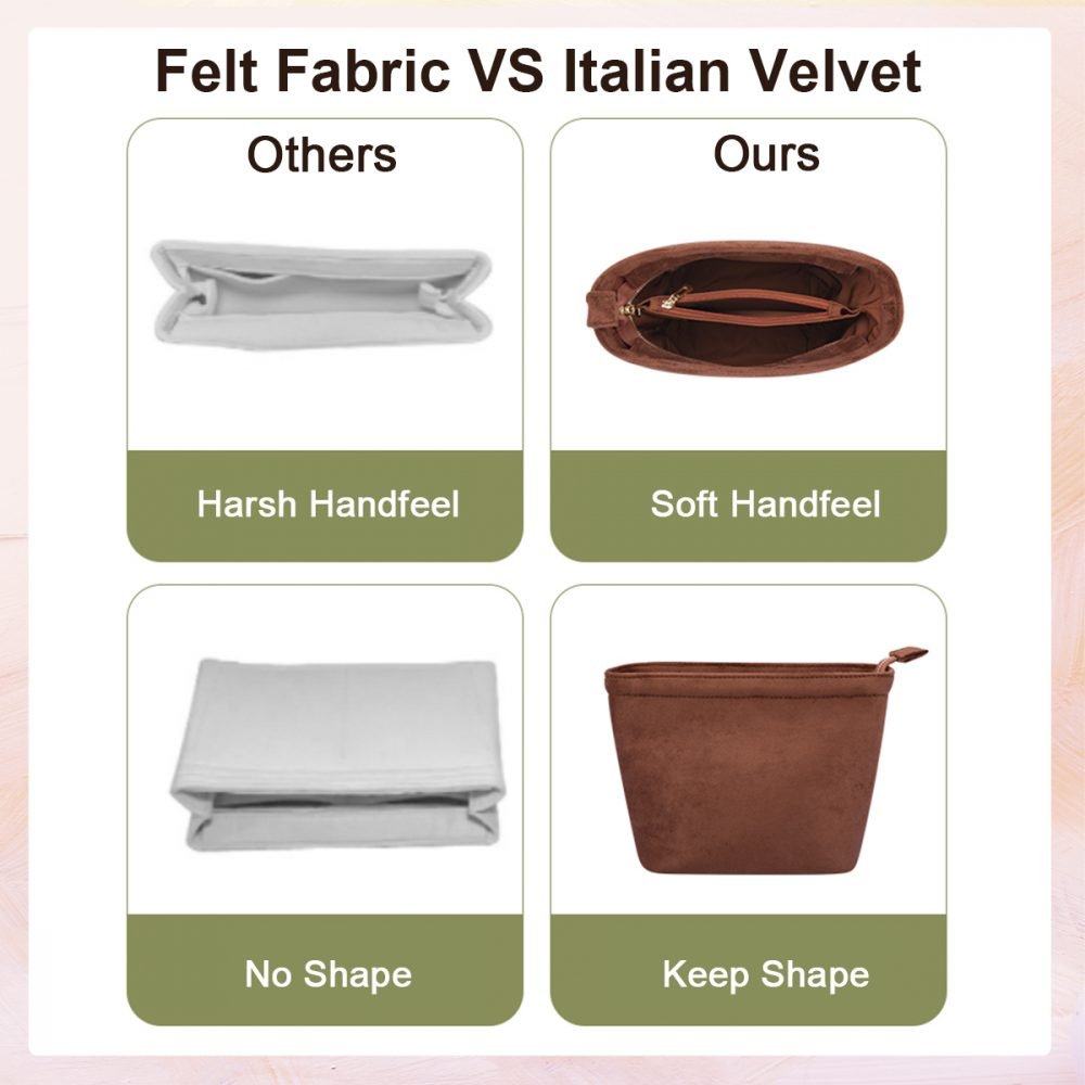 - All our bag organizers are elaborately handmade from high-quality Italian velvet, instead of felt material, allowing for a lightweight feature and a softer hand feel.