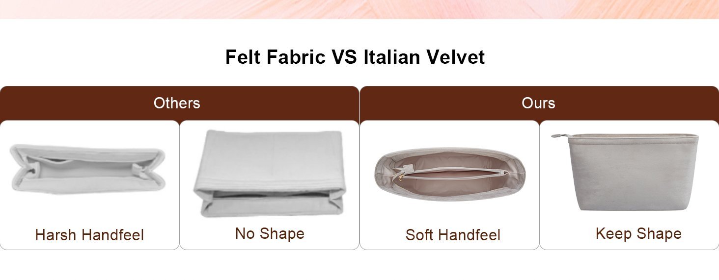 - All our bag organizers are elaborately handmade from high-quality Italian velvet, instead of felt material, allowing for a lightweight feature and a softer hand feel.