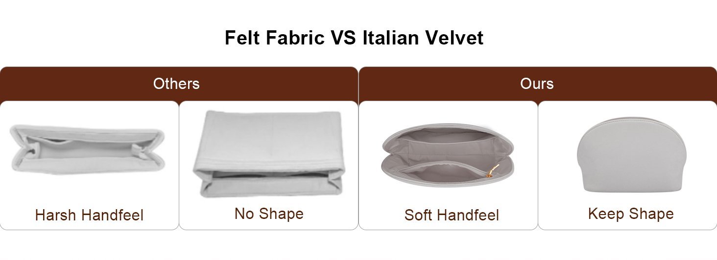 - All our bag organizers are elaborately handmade from high-quality Italian velvet, instead of felt material, allowing for a lightweight feature and a softer hand feel.