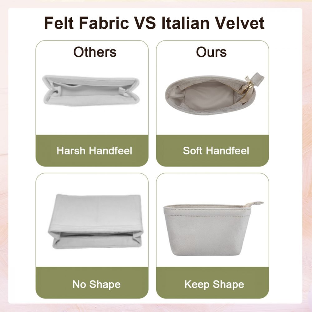 - All our bag organizers are elaborately handmade from high-quality Italian velvet, instead of felt material, allowing for a lightweight feature and a softer hand feel.