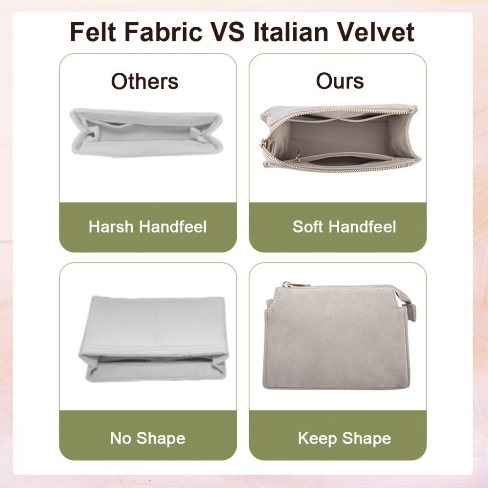 - All our bag organizers are elaborately handmade from high-quality Italian velvet, instead of felt material, allowing for a lightweight feature and a softer hand feel.