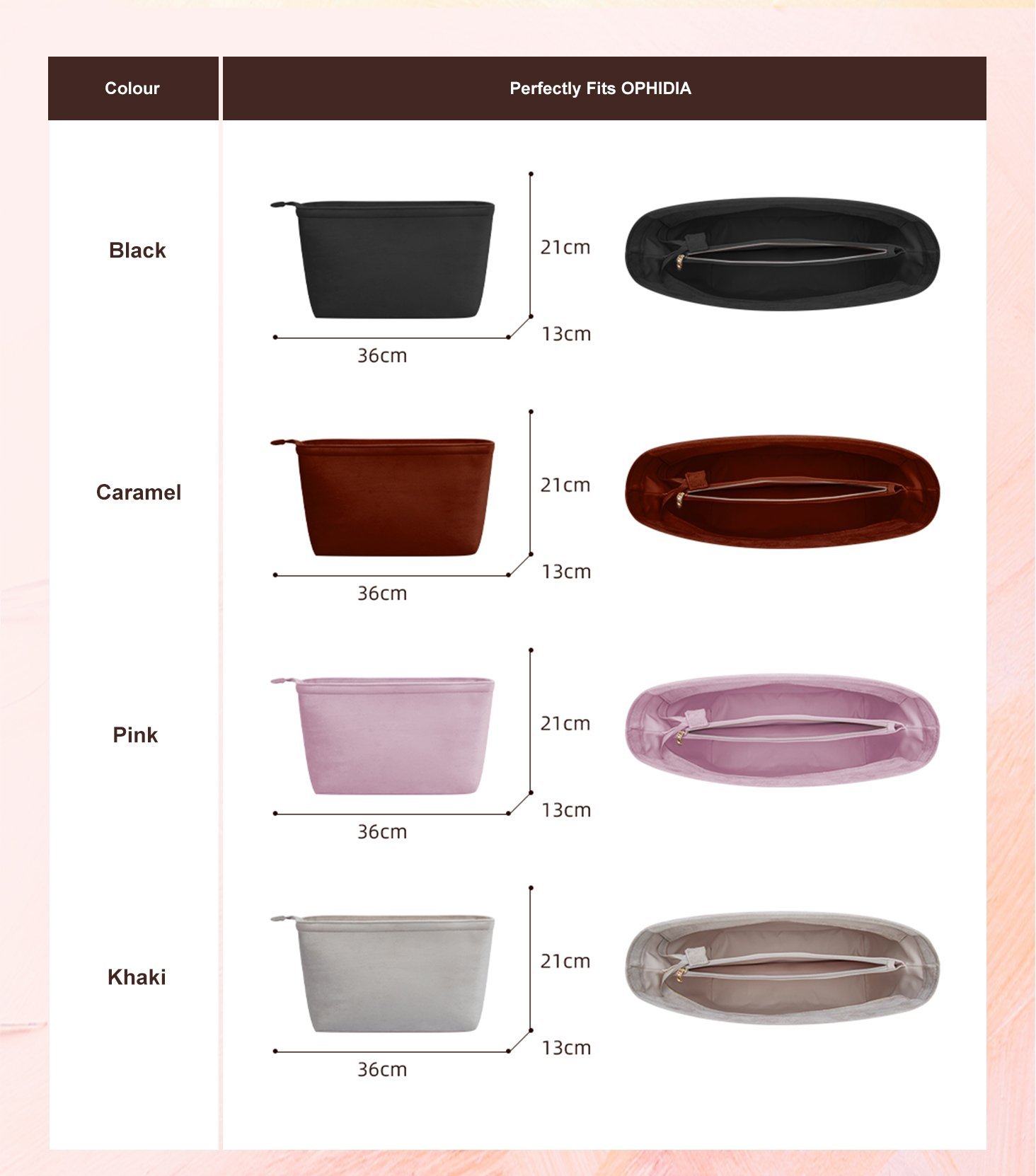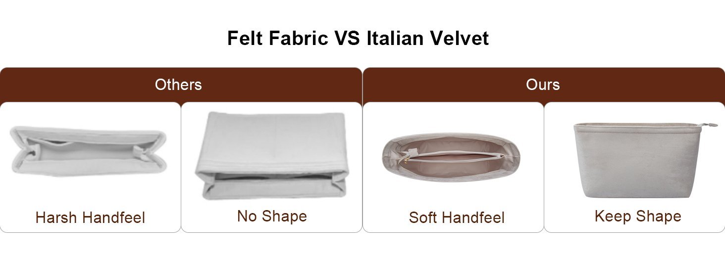 - All our bag organizers are elaborately handmade from high-quality Italian velvet, instead of felt material, allowing for a lightweight feature and a softer hand feel.