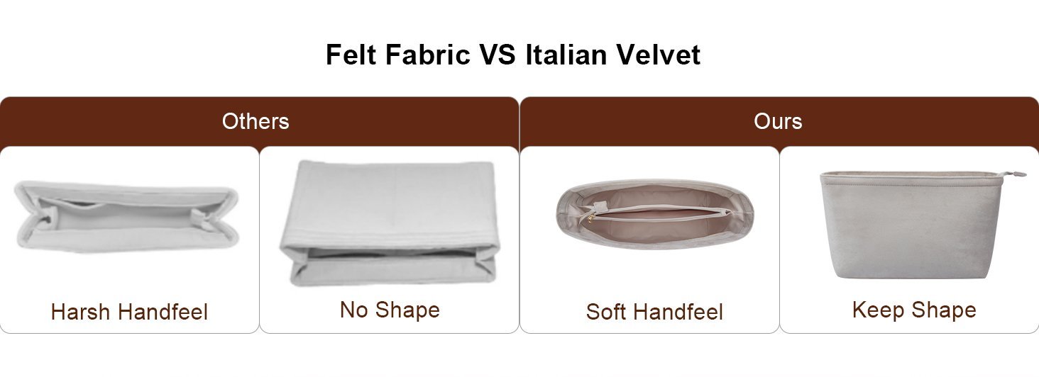 - All our bag organizers are elaborately handmade from high-quality Italian velvet, instead of felt material, allowing for a lightweight feature and a softer hand feel.