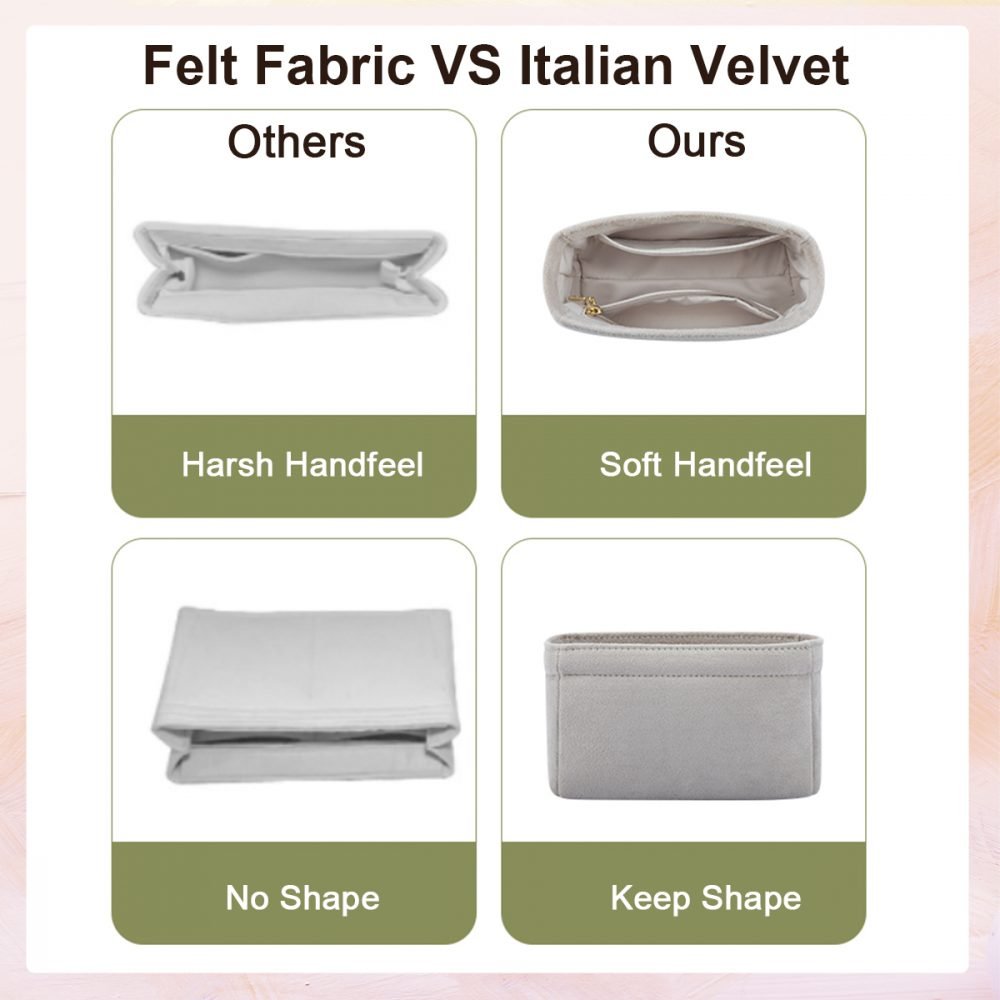 - All our bag organizers are elaborately handmade from high-quality Italian velvet, instead of felt material, allowing for a lightweight feature and a softer hand feel.