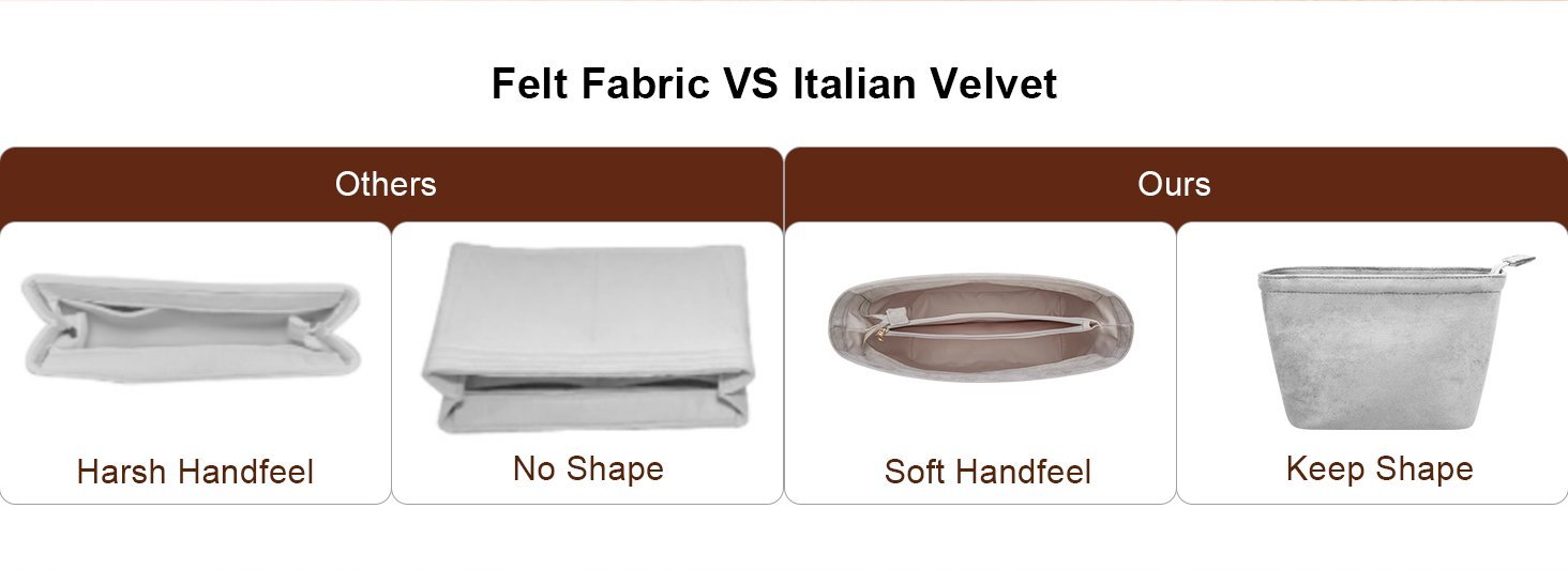 - All our bag organizers are elaborately handmade from high-quality Italian velvet, instead of felt material, allowing for a lightweight feature and a softer hand feel.