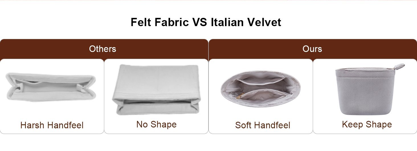 - All our bag organizers are elaborately handmade from high-quality Italian velvet, instead of felt material, allowing for a lightweight feature and a softer hand feel.