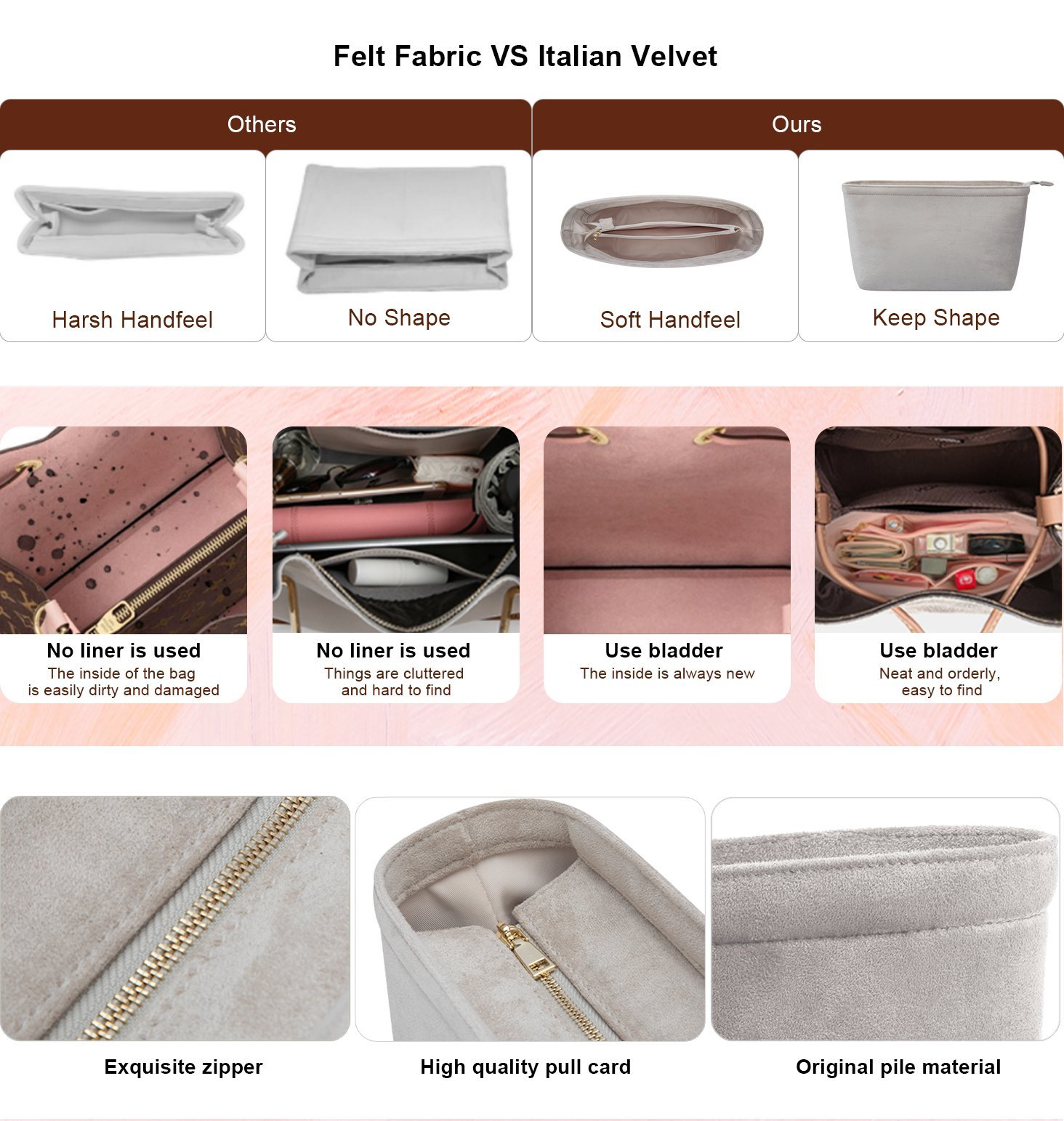 - All our bag organizers are elaborately handmade from high-quality Italian velvet, instead of felt material, allowing for a lightweight feature and a softer hand feel.