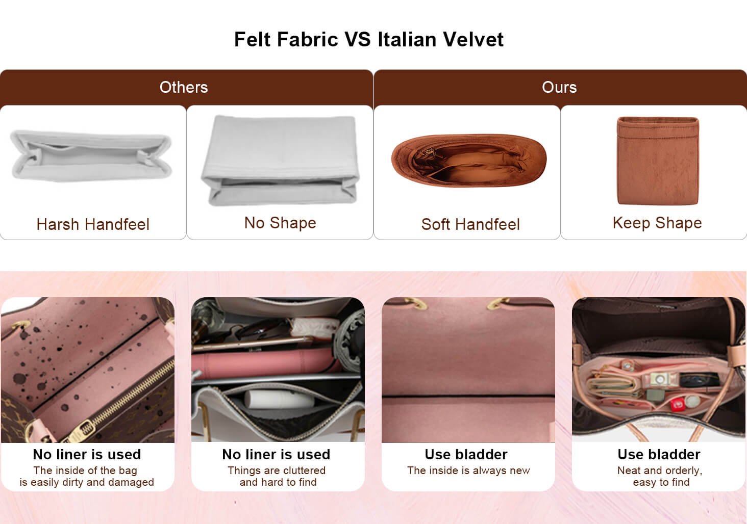 - All our bag organizers are elaborately handmade from high-quality Italian velvet, instead of felt material, allowing for a lightweight feature and a softer hand feel.