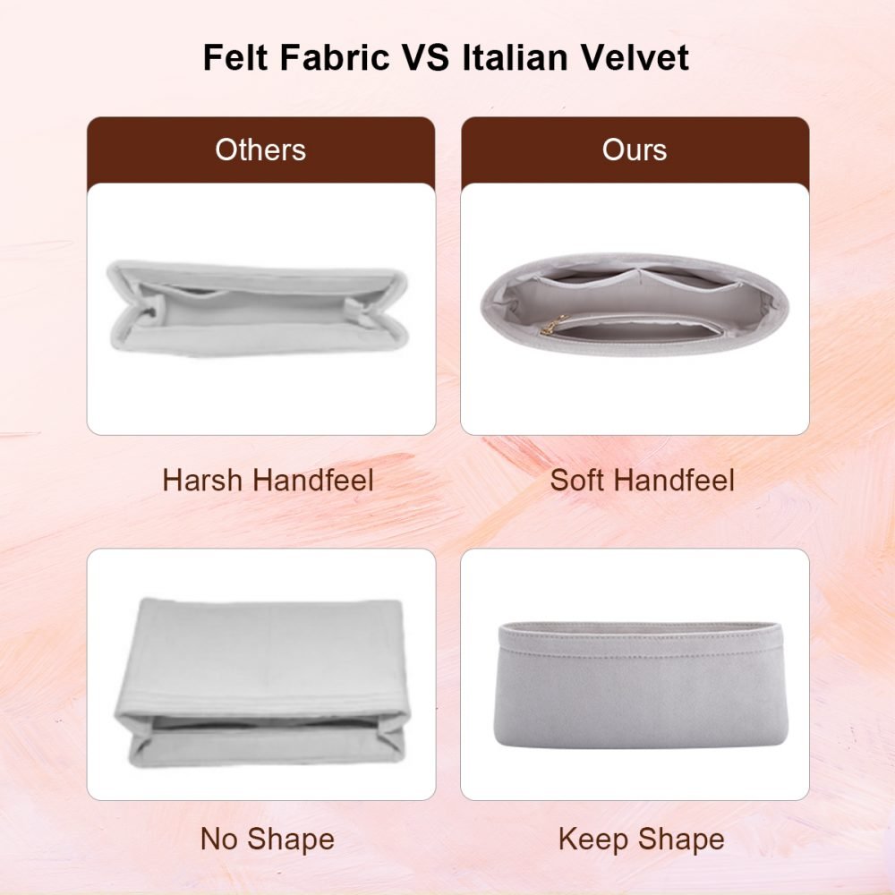 - All our bag organizers are elaborately handmade from high-quality Italian velvet, instead of felt material, allowing for a lightweight feature and a softer hand feel.