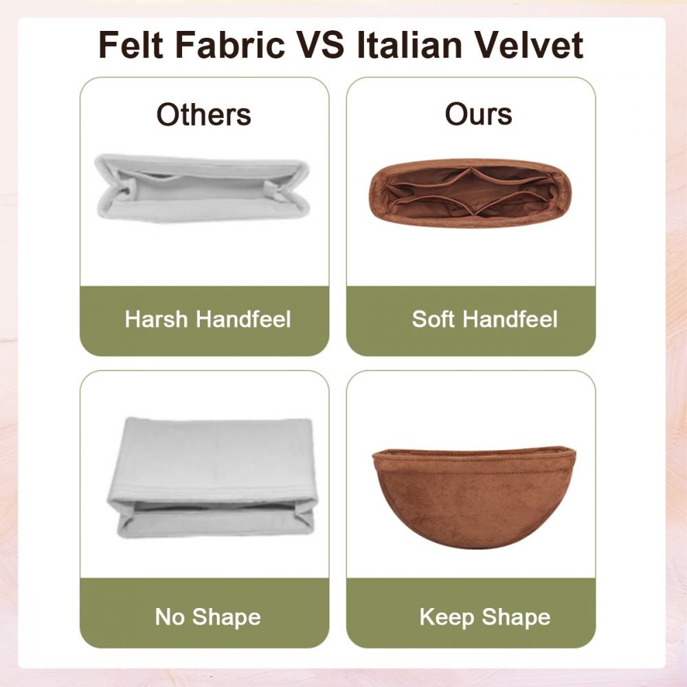 - All our bag organizers are elaborately handmade from high-quality Italian velvet, instead of felt material, allowing for a lightweight feature and a softer hand feel.