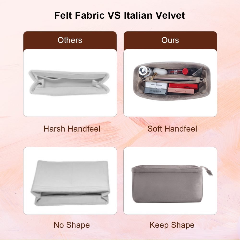 - All our bag organizers are elaborately handmade from high-quality Italian velvet, instead of felt material, allowing for a lightweight feature and a softer hand feel.