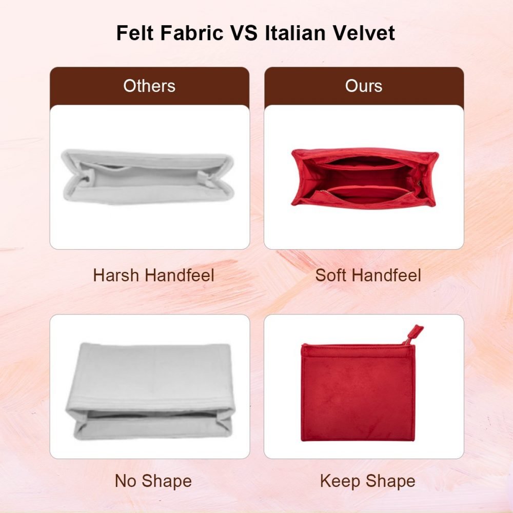 - All our bag organizers are elaborately handmade from high-quality Italian velvet, instead of felt material, allowing for a lightweight feature and a softer hand feel.