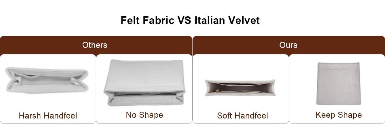 - All our bag organizers are elaborately handmade from high-quality Italian velvet, instead of felt material, allowing for a lightweight feature and a softer hand feel.