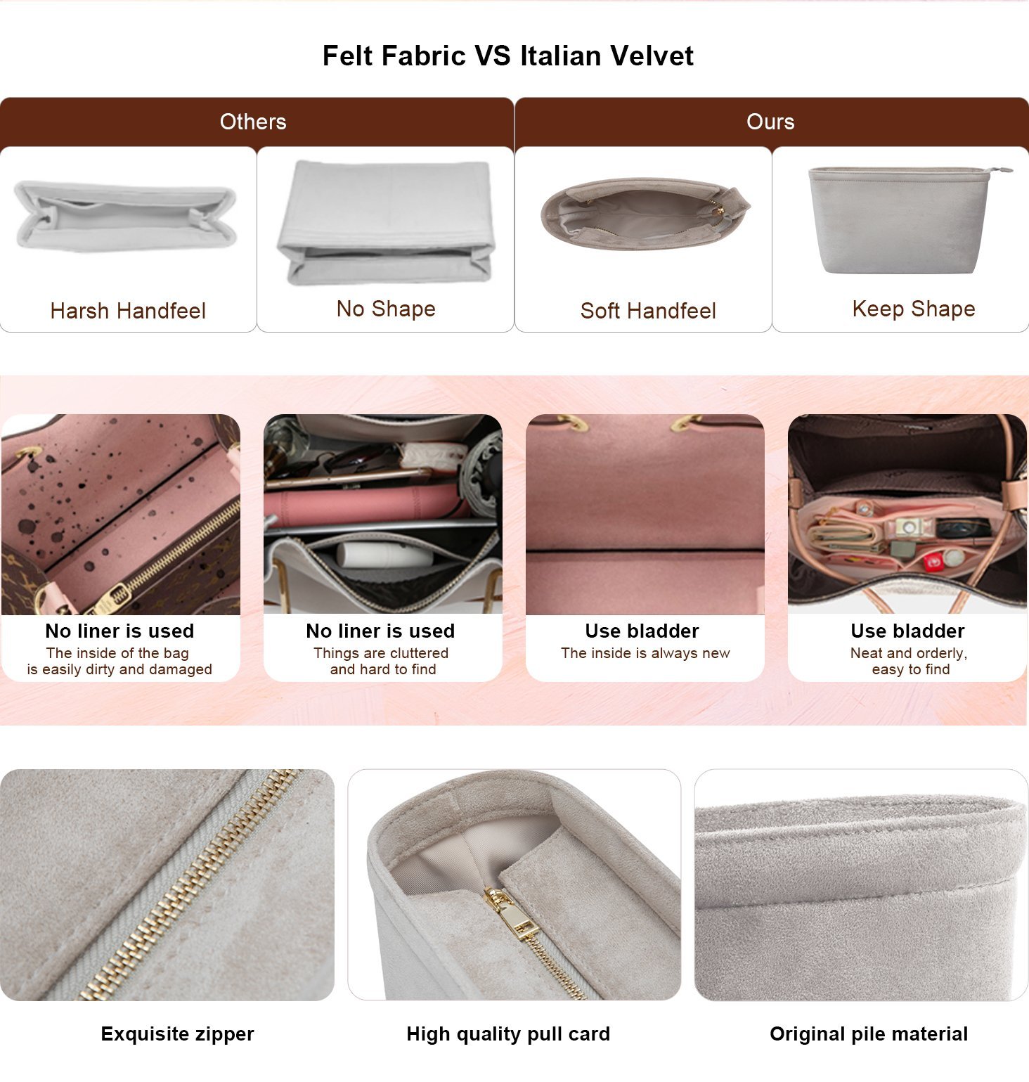• All our bag organizers are elaborately handmade from high-quality Italian velvet, instead of felt material, allowing for a lightweight feature and a softer hand feel.