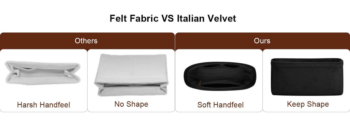 - All our bag organizers are elaborately handmade from high-quality Italian velvet, instead of felt material, allowing for a lightweight feature and a softer hand feel.